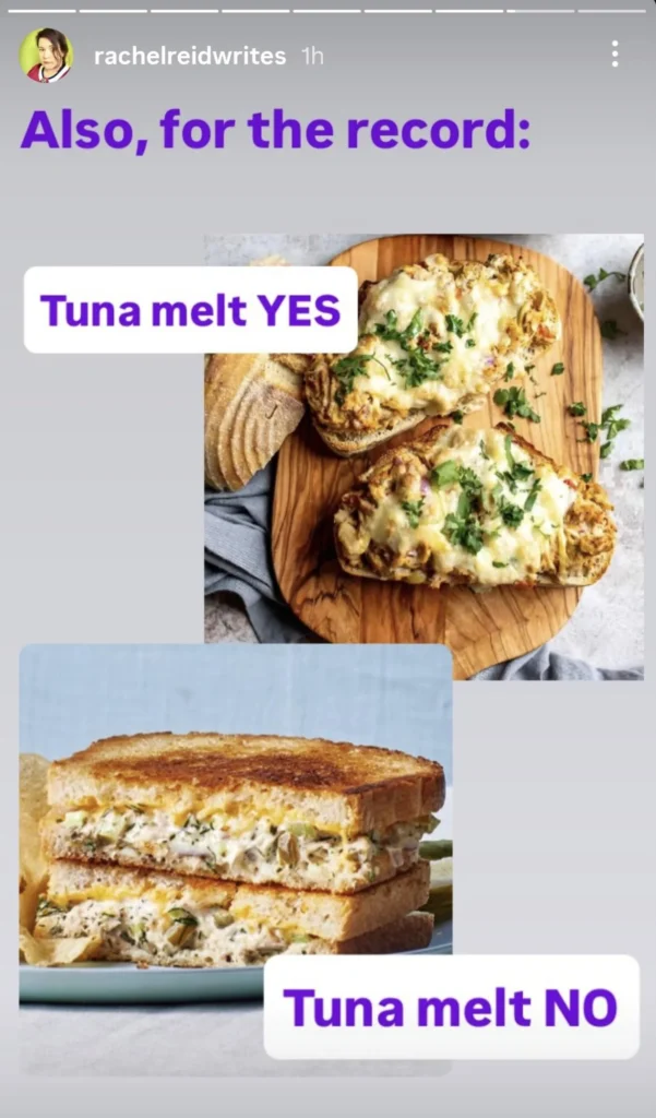 Rachel Reid also clarified on an Instagram story that Ilya’s tuna melt is open-faced rather than assembled like a sandwich.
